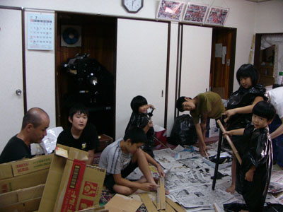 | ■少年少女全国大会(8/8)準備です。仮装の道具作ってます。御本部で、沿道よりの声援待っております。 |