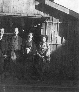 | 弘一師と冨美恵夫人は今一度、「此方の道は唐傘一本で開くことができる。 傘一本とは真一心になりきることぞ」との御教を改めて頂き直し、新たな布教地である、大阪市北区神山町八十九番地(現在は九番十五号)に御用始めた。 それは、正に「傘一本」であった。昭和二十四年四月二十五日、建物の無いこの地で、春の大祭を仕えた。続いて同年十一月に、仮の広前が建築された。 その建物は、屋根に瓦なく、天井、壁なく畳もない、窓にガラスもなければ、勿論電気もガスもない建物であった。 「人にものをたのむな」との御教のごと、ただ/\神を信じ、御用にお使い頂くことを願った。 |