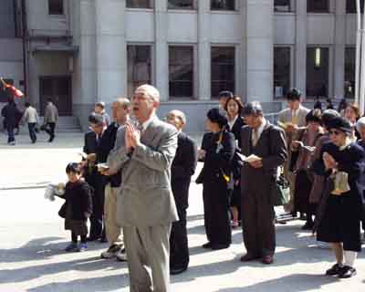 | ■大阪からの団体列車が数多くでておりました。4本の臨時列車(約2500人)がくまれ、御本部での滞在は、わずかな時間でしたので、奥城参拝も境内地より遙拝させて頂きました。 |