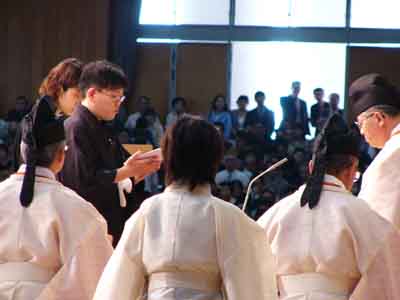 | ■新任教師拝命式 新任教師の代表が、金光様より辞令を頂きました。 | ■教団独立記念祭参拝6月8日。 |