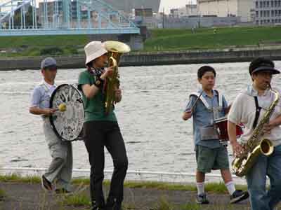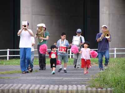 ■青少年夏合宿。8月御本部少年少女全国大会出場のため、淀川で行進練習します。