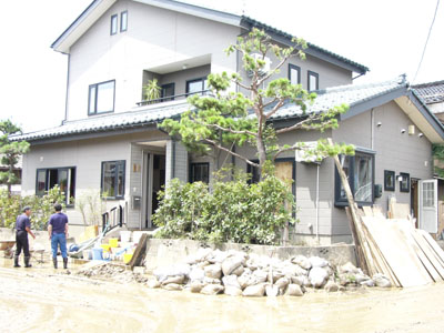 今回私がお手伝いさせてもらったお家。築6年できれいでしっかりしていたが、流木に窓を割られ、いっきに水が浸入してきたという。
