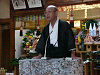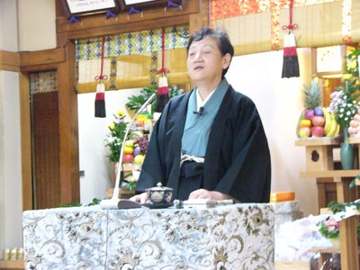 | 信奉者が白鷺の城の舞を披露して、花束贈呈、奥様先生の「40年褒賞を頂いて」とここまでのお礼を込めてお話をされました。元教会員によるお礼の発表、親先生の感話を聞かせて頂き、改めて各自の信心を見つめ直す機会になりたいものです。 |