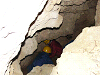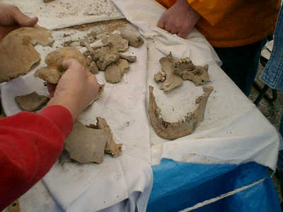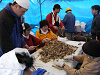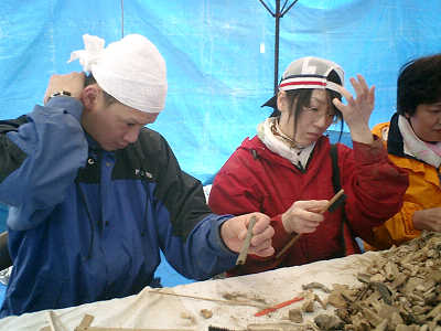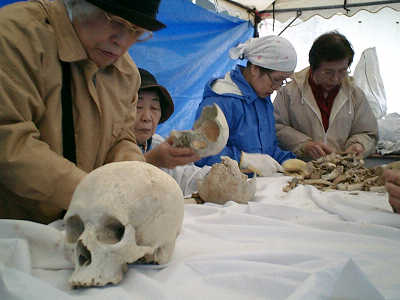 | 壕(ごう)と呼ばれる洞窟のような自然にできた地形で収集が続きます。 | 山に向かってご祈念をしているところ | お清めの模様。収集されたご遺骨を丁寧にブラシでついたお土を取り除く作業です。 | |